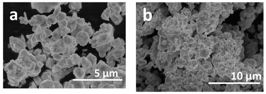 SEM images of BFO powders annealed at 650 °C are given in Figure 3. The SEM image with higher magnification (Figure 3a) indicates that BFO powders consist of quite uniform particles of polyhedral shape. Particle size and size distribution was estimated from several SEM micrographs using ImageJ software. It was determined that particles vary from 0.3 to 1.6 µm in size and 86% of all particles are in the range from 0.6 to 1.2 µm. It should be noticed that these particles tend to aggregate into larger agglomerates, which are clearly seen in Figure 3b.