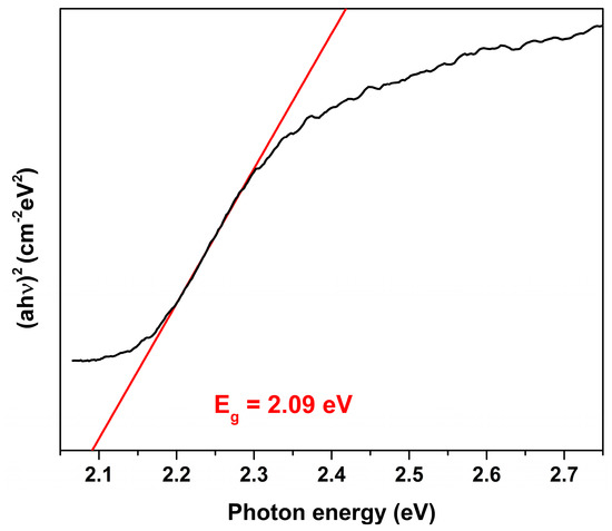 The value of n was chosen as 2, which corresponds to a direct band gap. As shown, the Eg value is estimated by extrapolating the linear part of (ahν)2 against the hv plot to the point a = 0. The calculated Eg value was 2.09 eV, which suggests that synthesized BFO powders effectively absorb visible light in the range of 380–593. Thus, the synthesized BFO powders exhibited a strong potential for the photocatalytic application for the degradation of organic pollutants using the visible light. This value is in a good agreement with Eg previously reported for BFO powders [39,40]; however, it is lower in comparison to that of BFO thin films [41]. Such difference could be explained by size effect and caused by the small thickness of the films.