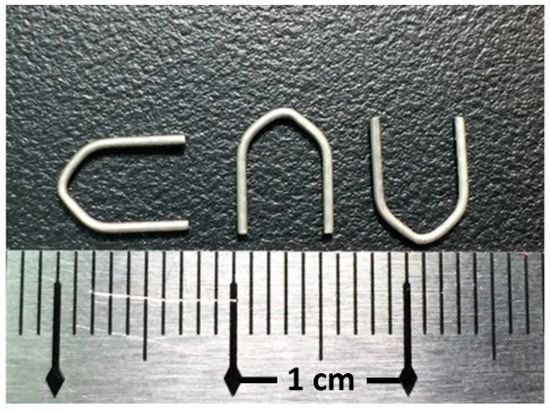 Mg-2.8Zn-0.8Ca alloy (ZX31) was produced from highly pure Mg (99.9%), Zn (99.9%), and Ca (99.8%) using an electric resistance heating furnace with a mild steel crucible under argon atmosphere. ZX31 hot-extruded alloy bars (diameter, 10 mm) were obtained at 350 °C, with a reduction ratio of 10:8 via continuous extrusion (speed, 15 cm/min) of the ingot (diameter, 90 mm). The as-extruded ZX31 alloy was cut into 3-mm-thick disks, which were used as specimens for the experiments. The chemical composition of the alloy is shown in Table 1. A rectangular line of 1 mm × 0.8 mm was produced using the as-extruded ZX31 by further extrusion with the same parameters. Finally, the hemostasis clips were made using a self-made stamping machine. These clips were manufactured by the Metal Industries Research and Development Center (MIRDC, Kaohsiung, Taiwan) and are shown in Figure 1.