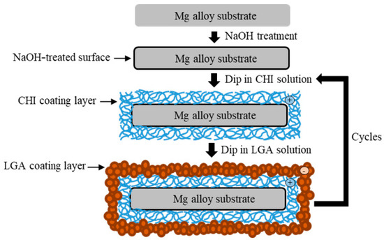 The specimens were ground with SiC paper of up to #2000 and ultrasonically cleaned with ethanol. Before coating, the specimens were soaked in 5 M of NaOH solution for 10 min with stirring to obtain hydroxylate (MgOH2) on the surface. The specimens were again washed with ethanol and then dried with warm air. The surface of the alloy became negatively charged after etching [14]. CHI (medium molecular weight) and LGA were purchased from Sigma-Aldrich (St. Louis, MO, USA). A cationic CHI solution (0.6 wt.%) was mixed with a 0.5% acetic solution to obtain the coating mixture. The pH was then adjusted to 5.0 ± 0.2 using 5 M of NaOH solution. The pH of the anionic LGA solution (10 g/L) was adjusted to 9.7 using 5 M of NaOH solution. First, the pretreated specimens were dip-coated in the CHI solution for 10 min and dried at 110 °C for 1 h. Thereafter, the specimens were dip-coated in the LGA solution for 1 min and dried at 110 °C for 1 h. A schematic illustration of the coating process is shown in Figure 2. The number of layers of CHI coating was used to name the samples. In this study, samples with either two or seven layers of CHI were produced via the aforementioned dip coating process. The samples were denoted as substrate ZX31 (CHI/LGA)2 or ZX31 (CHI/LGA)7.