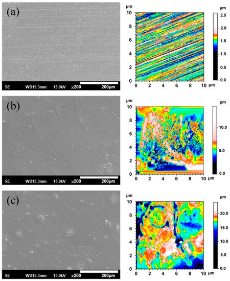 Figure 3 shows the SEM morphologies and 2-D texture height maps of the ZX31, ZX31(CHI/LGA)2, and ZX31(CHI/LGA)7 specimens. The uncoated specimen had visible scratches, which were attributed to the grinding process (Figure 3a), and the surface roughness (Ra) was 1.19 µm. The specimens coated with CHI are shown in Figure 3b,c. In contrast, there were no scratches on the CHI-coated Mg specimens (Figure 3b), indicating that the films fully covered the substrates. The ZX31(CHI/LGA)2 and ZX31(CHI/LGA)7 specimens exhibited some CHI agglomerations on the substrate, and the agglomerations of the ZX31(CHI/LGA)7 specimen were larger than those of the ZX31(CHI/LGA)2 specimen. Mainly because of the coating process, the surfaces of initially small agglomerations continued to have CHI deposited onto them. As the number of electrodeposition layers increased, the height of the surface increased. The surface roughness of the CHI-coated specimens increased from 1.72 µm (two layers) to 2.60 µm (seven layers). The surface roughness of the CHI-coated specimens was high due to the different deacetylation degrees of CHI molecules and the corrosion of the Mg substrate during film formation [30].