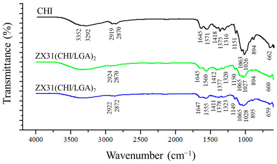FTIR spectra of pure CHI, ZX31(CHI/LGA)2 and ZX31(CHI/LGA)7 specimens.