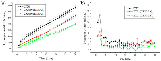 Volume of hydrogen for each of the specimens during a 30-day immersion test in SBF: (a) hydrogen evolution process of uncoated ZX31, ZX31(CHI/LGA)2, and ZX31(CHI/LGA)7 specimens immersed in an SBF solution at 37 ± 0.2 °C for 30 days; (b) H2 released per day.