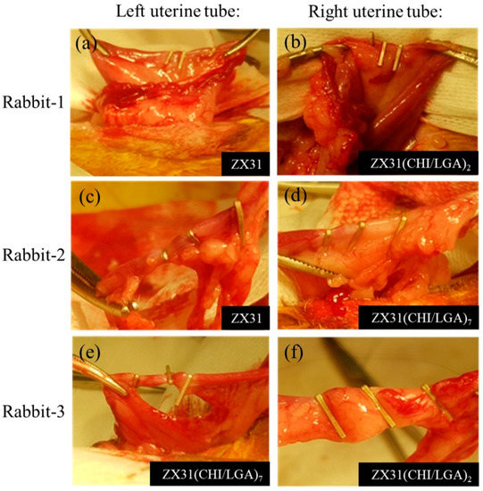 Finally, the left and right uterine tubes of the third rabbit were clipped with three ZX31(CHI/LGA)7 and three ZX31(CHI/LGA)2 Mg clips, respectively. The three rabbits were euthanized five weeks after surgery.