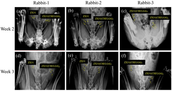 X-ray images of rabbits with Mg clips taken two and three weeks after surgery: (a) ZX31 and ZX31(CHI/LGA)2 Mg clips on the left and right uterine tubes of rabbit-1, respectively (second week); (b) ZX31 and ZX31(CHI/LGA)7 Mg clips on the left and right uterine tubes of rabbit-2, respectively (second week); (c) ZX31(CHI/LGA)7 and ZX31(CHI/LGA)2 Mg clips on the left and right uterine tubes of rabbit-3, respectively (second week); (d–f) the clips in the third week.