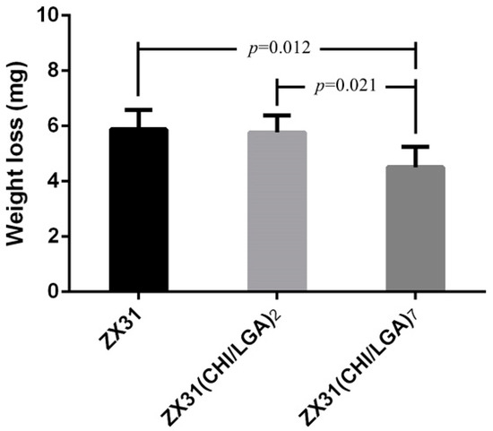 The degradation rates of ZX31 specimens with or without a chitosan coating were measured in simulated body fluid (SBF) at 37 ± 0.2 °C for 30 days. The released hydrogen (H2) volumes of the different specimens were measured to analyze the effect of the degradation rate of the coating and understand its corrosion behavior. The degradation rates of the different specimens are shown in Figure 5a. It can be seen that uncoated ZX31 exhibited a high degradation rate during the 30 days of immersion. Moreover, it can be seen that the degradation rates of the CHI-coated specimens were markedly low during this period. The average degradation rates of the ZX31, ZX31(CHI/LGA)2, and ZX31(CHI/LGA)7 specimens were 5.12, 4.11, and 3.03 mm/y, respectively. The specimen with seven layers of CHI coating exhibited a lower degradation rate when compared with that for the specimen with two layers. The improved corrosion resistance of the ZX31(CHI/LGA)2 and ZX31(CHI/LGA)7 specimens when compared with the ZX31 specimen can be attributed to the use of polyelectrolyte multilayers (PEMs). Moreover, an increase in the number of layers of CHI coating can delay the corrosion of the Mg substrate in corrosive environments.