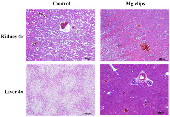 Figure 11 shows hematoxylin-and-eosin-stained, paraffin-embedded liver and kidney sections of the rabbits that were implanted with the coated Mg clips. No differences were observed between these rabbits and normal rabbits without Mg clip implantation in their liver and kidney sections. These results indicate that the Mg alloy with CHI coating showed good biocompatibility with animal organs (kidney, liver) [38]. The animals in the experiment exhibited good tolerance towards the products released due to the degradation of ZX31 and ZX31(CHI/LGA) alloy implants. Therefore, it is evident that the implanted clips are biocompatible in the early stage.