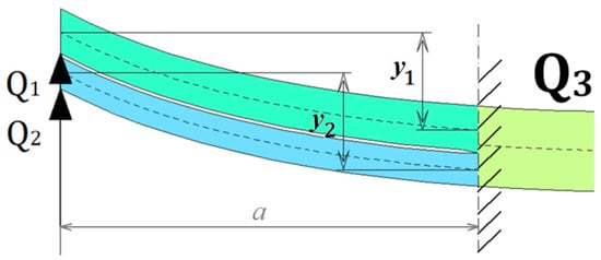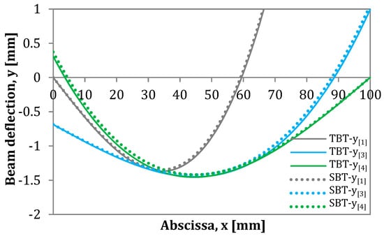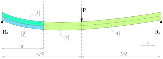 where the longitudinal extensional stiffness and of the sublaminates 1 and 2 can be calculated according to Appendix A. The above regions of the beam have the same deflection (), for specified abscissa :