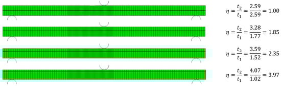 The analytical solutions derived in previous sections SBT and TBT were used to determine the deflection curves of centrally loaded AENF specimens, which were then compared with a numerical model in ABAQUS/Standard software. Four cases of glass fibre-reinforced laminates have been modeled. In numerical simulations, a standard and directly available in ABAQUS, model of lamina in plane-stress was used, based on FSDT. A continuum of shell elements was used with only three integration points through the thickness. The interface between the top and bottom sublaminate was modeled by cohesive elements with a thickness of 0.01 mm. The properties of cohesive elements for the GFRP interface in direction 0°//0° can be found in reference []. A rectangular mesh with a size of 1 mm was applied into the model, while in the crack tip area, the mesh size was refined into 0.5 mm, as shown in Figure 6. Four laminates have been considered—one symmetrical and three asymmetrical with different asymmetry ratios , where and are the thickness of sublaminate 1 and sublaminate 2, respectively.