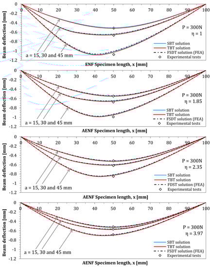 This article presents a complete analytical solution for the deflection and compliance of AENF and AENF test specimens with arbitrary geometry and material and stacking sequence, crack length, and fixture span. For comparison, the analytical solutions are presented using both the SBT and the TBT. Analytical models are validated by performing numerical finite element analyses in ABAQUS software (2017, Dassault Systèmes Simulia Corp., Johnston, RI, USA), using a built-in model of lamina based on first-order shear deformation theory (FSDT) [,].