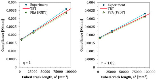 The results of the theoretically performed compliance–calibration tests based on the derived TBT model are presented in Figure 9 and Figure 10.
