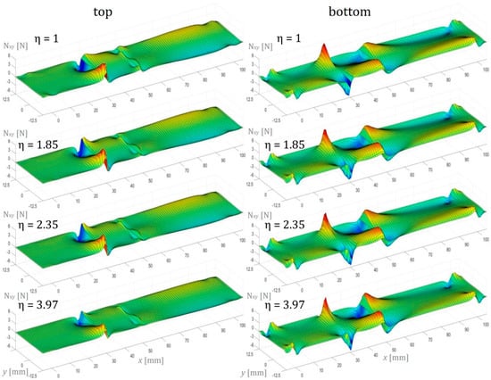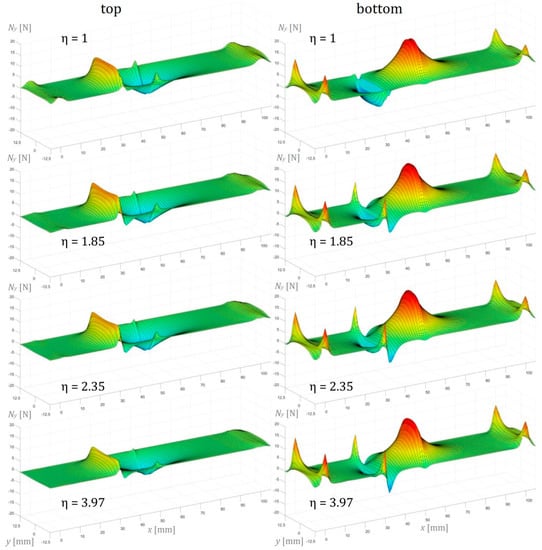 Conversely to the longitudinal normal forces Nx, the normal forces in the perpendicular direction Ny are rather small and have not exceeded 20 N (Figure 14). However, their distribution is more non-uniform, exhibiting significant fluctuations especially on the edge at the vicinity of the crack tip (for ), as well as in the regions of the specimen in contact with the fixture support and central indenter. It should be noted that in the top adherent, the globally compression forces induced by the central indenter evolve into the tension in the delaminated part, which is close to the crack tip. Such effect seems to be rather independent of the unidirectional laminate configuration, exhibiting similar behavior for symmetrical () and asymmetrical laminates ().
