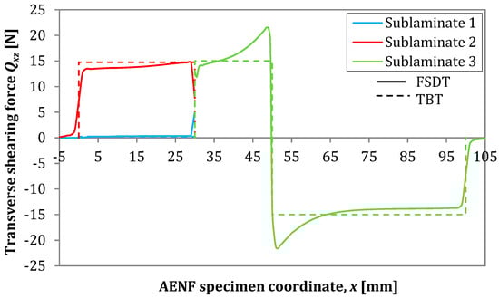 In this section, the influence of applied theories on the magnitude of loads acting on the AENF specimen as a function of crack length was analyzed. The SBT and TBT models, as well as the numerical model FSDT were used for the determination of shearing forces Q1 and Q2 acting in the 1st and 2nd region of AENF specimen. The comparison is shown in Figure 11.