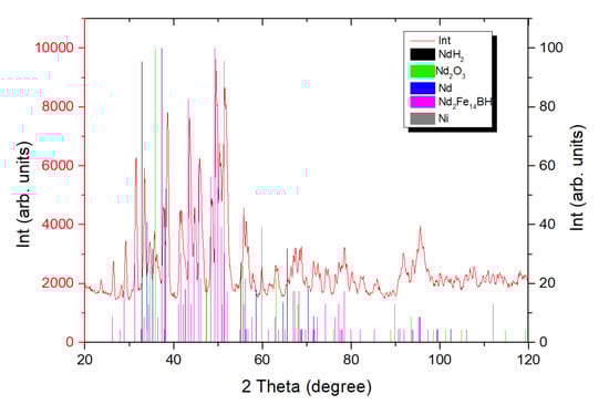 The identified phases are typical of powder mixtures obtained after hydrogen decrepitation. Therefore, it was assumed that the hydrogenation of the Dy-containing magnet would result in the formation of a hydrogenated, Dy-containing main magnetic phase, (Nd,Dy), likely (Nd,Dy)Hx. REM oxides and nickel can also be present. In the case of the recycling process, a small amount of Ni originating from the initial magnet coating was present. It should be noted that a high nickel content in the powder mixture can lead to a decrease in the physical density of the prepared magnets, worsening their magnetic hysteretic characteristics (in particular, the coercive force), as well as the formation of laminations on the magnet surface. The presence of Ni in Nd-Fe-B-based powders manufactured from hard-disk devices was demonstrated in [10,11]. Sieving, combined with mechanical agitation, decreases the Ni content to ~325 ppm [10]. When the Ni-containing coating was removed prior the preparation of the powder, the Ni content in the final magnet was 300 ppm. This fact indicates the possibility of the removal of the coating by sieving after hydrogen decrepitation, since no significant difference in its content was observed between the two methods of Ni removal during recycling.