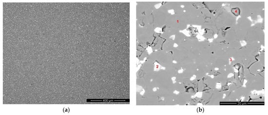 The structure of sintered magnets prepared by recycling was studied by electron scanning microscopy and EDX analysis. The microstructure of the magnet is given in Figure 2a,b. The chemical compositions of the observed phases are given in Table 2.