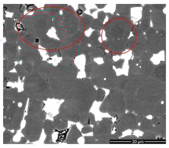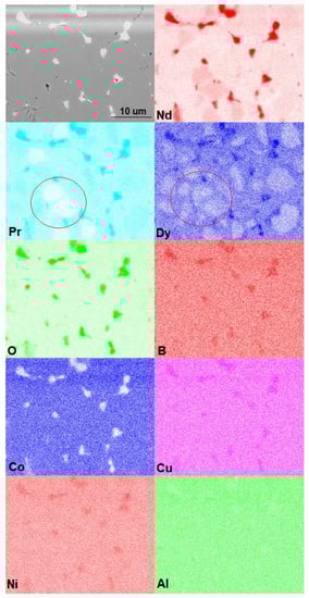 To clarify the distributions of elements in the phases and within the grains of the main magnetic (Nd,Dy)2Fe14B phase, X-ray elemental mapping was performed (Figure 4). As shown, grains enriched in Nd and depleted of Pr were observed (as shown by the red circles in Figure 4), which were inherited from magnets of different grades. The dysprosium distribution demonstrated obvious core-shell structures; Dy, along with the other REMs, was also present in triple junctions of the 2-14-1 phase grains. The triple junctions were enriched in oxygen; this indicated the presence of Nd, Dy, and Pr in the form of oxides. Cobalt was present in all phases; this fact indicated the formation of (Nd,Dy)2(Fe,Co)14B with dissolved Co. Nickel was also observed in the triple junctions and oxide phases.
