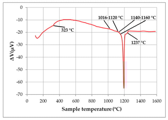 The sintering temperature of the magnets was corrected using DTA data (Figure 5). A number of anomalies which occurred within a temperature range of 1080–1120 °C allowed us to accurately choose the sintering temperature of the magnets, which was 1118 °C; the temperature of post-sintering heat treatment was 500 °C (1 h). The Curie temperature of these magnets was determined to be equal to 323 °C (see Figure 5).