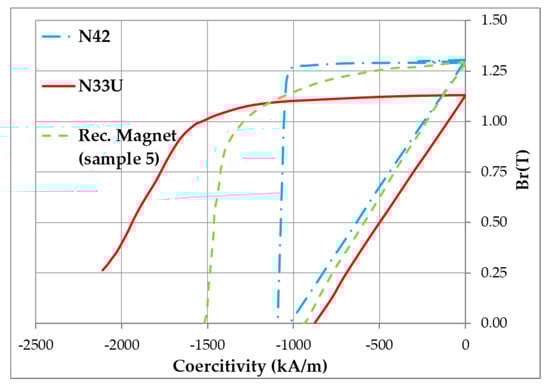 The magnetic characteristics of the magnets prepared using N42 and high-coercivity Dy-containing magnets are given in Table 3 and Figure 6. For comparison, Table 3 shows the magnetic characteristics of magnets prepared by the recycling process using scraps of magnets and HDD magnets taken in different proportions.