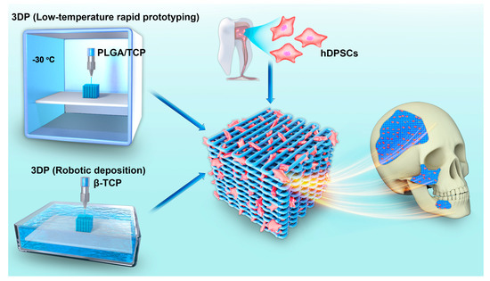 Another essential aspect of a 3D printed scaffold is the seeding and co-culturing of the scaffolds with stem cells before implantation. To date, many studies have demonstrated that bone marrow mesenchymal stem cells (BMSCs) possess multilineage differentiation potential and can be widely used as seed cells for bone tissue engineering [18,19]. However, BMSCs are difficult to harvest, and its phenotypic behaviors are disabled during the culturing and expanding phases [20]. To counter these issues, in recent years, researchers have turned their attention to the use of human dental pulp stem cells (hDPSCs) instead. hDPSCs can be obtained from extracted wisdom teeth or teeth extracted due to orthodontic reasons, without additional injury. Some researchers have already isolated hDPSCs from adult human dental pulp and found that, like osteoblasts, hDPSCs expressed bone biomarkers such as type I collagen, alkaline phosphatase, and osteocalcin [18,21]. Furthermore, findings indicated that hDPSCs efficiently induced improvement in periodontal bone regeneration when implanted with conventionally made β-tricalcium phosphate (β-TCP) into swine [22]. Thus far, a lack of reporting of mechanical and biological comparison, especially with hDPSCs on different manufactured 3D-PLGA/TCP, 3D-TCP scaffolds, remains to be expanded.