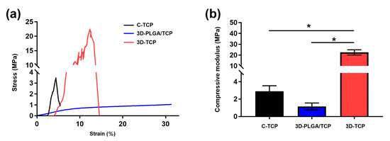 Mechanical properties of C-TCP, 3D-PLGA/TCP, and 3D-TCP scaffolds. (a) Compressive strain–stress curves indicated that 3D-PLGA/TCP possessed flexible mechanical properties. (b) Effects of 3DP and β-TCP amounts on the compressive modulus (* p < 0.050).