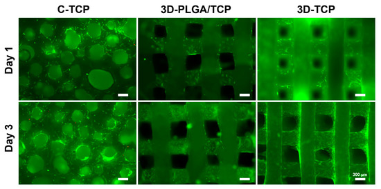 The biological response of stem cells on materials is affected by many factors, such as material composition, macropore size, micro surface morphology, and so on [29,30]. For dentists, hDPSCs is present as mesenchymal stem cells in dental pulp tissue, which are easier to obtain than other cells, and have excellent osteogenic differentiation properties [21]. When materials were applied directly, hDPSCs cells were embedded into the materials, which provides advantageous biomimetic microenvironments for cell adhesion, proliferation, and migration [22]. However, the adhesion and proliferation of cells normally occur only on the surface of conventional materials and cells cannot migrate deeply into materials due to the lack of well-interconnected pores [19,31]. Approaches facilitated by the use of live/dead staining have results indicating that C-TCP, 3D-PLGA/TCP, and 3D-TCP are biocompatible materials and could be used to provide stable environment for hDPSCs. hDPSCs viability at early time-points provides limited information related to cellular metabolic activity and should be used in conjunction with AlamarBlue. Thus, these developed 3D structures and materials could be used to strengthen cell migration and to facilitate their osteointegration, which has been identified as a critical factor involved in bone regeneration in vivo and, therefore, should be investigated in further research efforts.