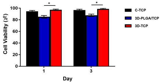 hDPSCs viability of C-TCP, 3D-PLGA/TCP, and 3D-TCP scaffolds. C-TCP and 3D-TCP scaffolds showed good cell viability over time, whereas 3D-PLGA/TCP scaffold had significantly lower cell viability than the other two groups (* p < 0.050).