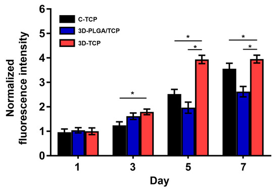 The proliferation of hDPSCs on each group of scaffolds after 1, 3, 5, and 7 days of co-culturing are reported in Figure 6. In general, proliferation rates of hDPSCs in all groups increased over time. This result confirmed that C-TCP, 3D-PLGA/TCP, and 3D-TCP are quite feasible for use as carriers of hDPSCs. On day 1, there were no significant differences in these three groups. However, on day 3, the proliferation of 3D-PLGA/TCP and 3D-TCP groups were higher than of the C-TCP group. However, results also indicated that cell metabolic activity in the 3D-PLGA/TCP group was significantly lower than in the 3D-TCPgroup on days 3, 5, and 7. Additionally, a similar phenomenon was observed that the hDPSCs proliferation in the 3D-TCP group was higher after 3 days of co-culturing compared to C-TCP group.
