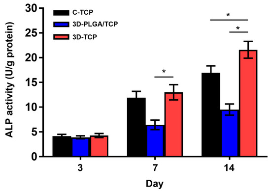 The effect of C-TCP, 3D-PLGA/TCP, and 3D-TCP scaffolds on ALP activity. The 3D interconnected structure and β-TCP amount enhanced the ALP activity on day 3, 7, and 14 (* p < 0.050).