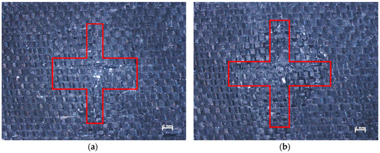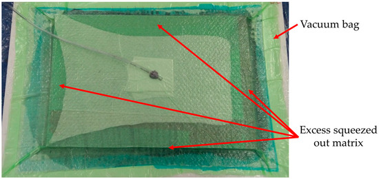 For the symmetrical fabrics, all of the reinforcing layers were laid in the same orientation. For the fabrics that were not completely symmetrical (small differences in the fabric setting between the directions in which the fibers are arranged), the layers were stacked alternately (the fabric was rotated by 90° every layer). The manufacturing process was conducted with −68 kPa of vacuum pressure support. The vacuum support meant that the excess matrix was squeezed out of the composite. The amount of the resin that was squeezed out from between the reinforcing layers is shown in Figure 1.