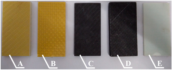 Samples cut from epoxy composites with sixteen layers of reinforcing fibers: A—Twaron 2200, B—Kevlar 49, C—Pyrofil TR30 S, D—HR 12K, E—Dyneema SK 60.