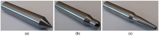 Based on the specifications in the literature [25,34,35,36] and the technical requirements of the test stand, the geometry of the three strikers (conical striker, hemispherical striker and ogival striker) was developed. The strikers were designed with dimensions that allowed them to be the same weight (about 49 g). This was important as this means they will have the same impact energy during an impact at the same velocity. This in turn allowed the authors to assess the impact of the striker’s geometry on the resulting damage to the composites. The strikers were made from S235JR steel. The dimensions of the strikers are shown in Figure A1 and the manufactured strikers are shown in Figure 3.