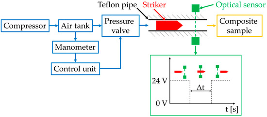 The research concerning the low velocity impact response of the composites was conducted with the use of a pneumatic launcher. This device consisted of several main parts, such as a compressor, an air tank with a manometer, a control unit, a pressure valve, a Teflon pipe (Teflon minimizes the friction between the striker and pipe) and an optical sensor. The scheme of the launcher is presented in Figure 4.
