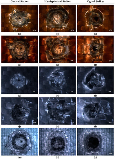 The damage caused by the impact of the ogival striker was similar to the damage caused by the conical striker. In the case of the samples that deformed plastically (Figure 5c,f,o), the pointy end of the striker burrowed in between the reinforcing fibers and pushed them sideways. This phenomenon was much less apparent in the composites reinforced by carbon fibers (Figure 5i,l), where the damage was brittle. Independent of the type of reinforcing material, the fibers were ripped out of the matrix. The sample reinforced by Dyneema SK 60 fibers (Figure 5o) was an exception because there was no sign of the fibers having been ripped out of the matrix. However, in this sample, the largest deformation around the impact point was observed (diameter of 11.4 mm). The material which was displaced by the striker created a characteristic ring around the impact point. The diameter of this deformation was larger than the diameter of the area in which the fibers were ripped out of the matrix in the other samples hit by the ogival striker (see Table 5). During the analysis of the images presented in Figure 5 and damaged areas diameter presented in Table 5, some similarities could be seen. Independent of the kind of reinforcing material (aramid, carbon), the use of fabrics with a higher weight (made from Kevlar 49 and HR 12K fibers) resulted in more damage (a lot of fibers ripped out of the matrix around the impact point) in the epoxy composites after a low velocity impact, than in the case of the same kind of the reinforcing materials but with a lower weight (fabrics made from Twaron 2200 and Pyrofil TR30 S fibers). The epoxy composite that was reinforced with the fabric with the lowest weight (Dyneema SK 60) was characterized by the absence of this type of damage (fibers ripped out of the matrix).