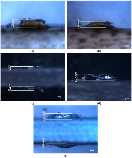 In the case of the sample in which Twaron 2200 fibers (Figure 6a) were used as reinforcement, the fibers that were ripped out of the matrix were narrowly focused around the cavity. The fibers that were ripped out of the matrix protruded less than in the case of the sample that was reinforced by Kevlar 49 fibers (Figure 6b). However, as can be seen in Figure 5f the diameter of the area in which the fibers had been ripped out of the matrix was larger in the case of the composite reinforced by Kevlar 49 fibers (11 mm), than in the case of the sample reinforced by Twaron 2200 fibers (9.8 mm). In the case of the samples in which carbon fibers were used as the reinforcing material (Figure 6c,d), the fibers that were ripped out of the matrix protruded less than in the case of the samples reinforced by aramid fibers. The carbon fibers that were ripped out from the matrix had been crushed (Figure 6c,d). In the image of the sample reinforced by Pyrofil TR30 S fibers (Figure 6c), a bulge on the opposite side to the impact side can be observed. A similar bulge can be observed in the image of the sample reinforced by Dyneema SK 60 fibers (Figure 6e). Despite the same number of reinforcing layers in all of the samples, the composites reinforced by fabrics made from Pyrofil TR30 S and Dyneema SK 60 fibers were the thinnest, which may have affected the formation of these bulges. Taking into account the bulges formed at the opposite side to the impact side, the damage to these composites could be much more serious than it seems. In the case of the samples reinforced by Pyrofil TR30 S fibers, damage on the opposite side to the impact side was also visible; this damage is shown in Figure 7.