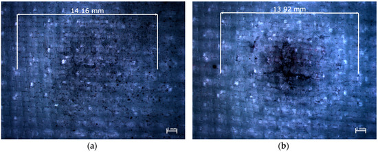 The diameters of the damaged areas presented in Figure 5 were measured and presented in Table 5. The diameters of the damaged areas were measured on the first reinforcing layer on the side of the impact. The measured area included the cavity and any visible damaged fibers (such as fibers ripped out from the matrix around the cavity).