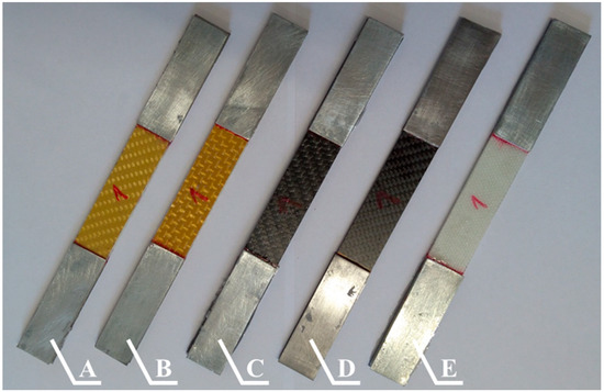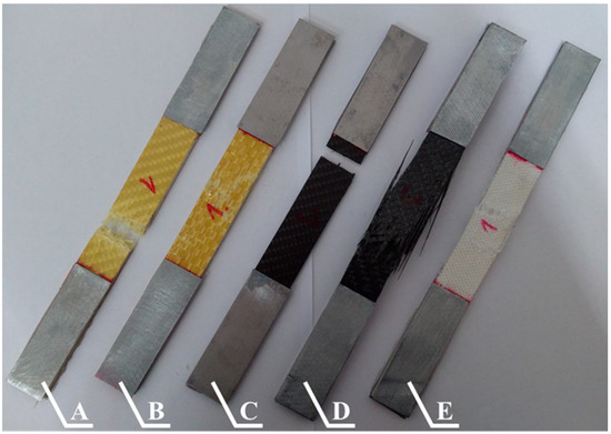 Selected epoxy composites samples with reinforcement made from the following fibers: A—Twaron 2200, B—Kevlar 49, C—Pyrofil TR30 S, D—HR 12K, E—Dyneema SK 60 after the tensile test.