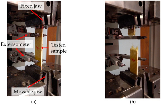 Tensile test of a composite sample reinforced by Twaron 2200 fibers: (a) sample (with active extensometer) placed in the jaws, (b) sample after rupture.