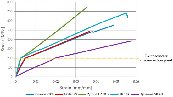 The characteristic change of the slope angle of the curves can be seen after the stress of the samples reached 200 MPa; this was due to the disconnection of the extensometer. After this stress value, the strain was measured based on the testing machine’s traverse displacement, which is the sum of: strain of the sample test section, displacement between the sample and steel covers (if occurs), displacement between steel covers and testing machine jaws (if occurs), stiffness of the testing machine and kinematic clearance. The Young’s modulus was calculated based on the first part of the stress–strain curves (based on the sample strain measured by the extensometer) presented in Figure 11 (before the slope angle of the curves changed). The Young’s modulus was determined at strain values of ε1 = 0.0005 and ε2 = 0.0025. In the case of the samples reinforced by HR 12K fibers, due to the high value of its Young’s modulus, this was determined at strain values of ε1 = 0.0005 and ε2 = 0.002. Such strain values were adopted because the ε2 strain value corresponds to the σ2 = 197.8 MPa stress value. If the strain value ε2 was adopted in the calculations, in accordance with the literature [37] (ε2 = 0.0025), then the calculated Young’s modulus will be burdened with an error resulting from the sample’s strain measurement from the traverse testing machine. Out of all of the composite samples reinforced by HR 12K fibers, only one was destroyed during the test. This was because the range of the machine is too small (its 100 kN load limit was exceeded).