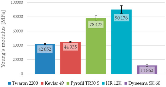 The samples reinforced by Dyneema SK 60 fibers are characterized by the largest strain at break (0.0307). This value is about three times greater than in the case of the samples reinforced by aramid or carbon fibers. The samples reinforced by Dyneema SK 60 fibers are also characterized with the lowest Young’s modulus (11.9 GPa). This is about four times lower than in the case of the samples reinforced by aramid fibers. The smallest strain at break was observed in the case of the samples reinforced by carbon fibers; for these samples, the Young’s modulus was the highest among all of the analyzed cases. This is about two times higher than in the case of the samples reinforced by aramid fibers. This is why carbon fibers are often used in hybrid composites to increase their stiffness [24].