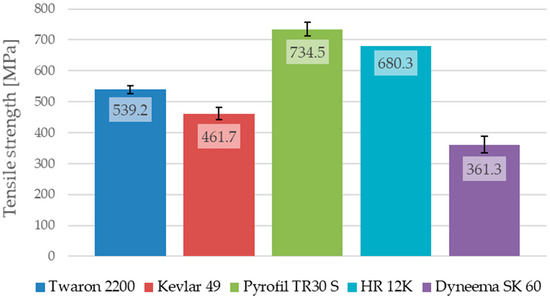 The analysis of the results, presented in Table 6, shows that the results obtained for the composites with various types of reinforcement, but made from the same kind of reinforcing fibers, are different. The tensile strengths for the composite samples reinforced by aramid fibers are different to the samples reinforced by the Twaron 2200 and Kevlar 49 fibers; the Young’s modulus and strain at break are also different. The samples reinforced by Twaron 2200 fibers were characterized by a higher tensile strength (difference about 77.5 MPa) in comparison to the samples reinforced by Kevlar 49 fibers. They are also characterized by a slightly lower Young’s modulus (difference about 2.8 GPa) and a higher strain at break (difference about 0.0025). It is worth noting that, the fabric made from Twaron 2200 fibers is characterized by a lower weight than the fabric made from Kevlar 49 fibers, which could have had an impact on the strength properties of the multilayered composites that were prepared with the use of those reinforcing materials. The samples reinforced by Pyrofil TR30 S fibers are characterized by a much lower Young’s modulus in comparison to the samples reinforced by HR 12K fibers (difference about 11.7 GPa). The fabric made from HR 12K fibers has a much higher weight than the fabric made from Pyrofil TR30 S fibers. This correlation is identical to the case of the samples reinforced by aramid fibers. This has shown that the use of a reinforcing fabric with a higher weight results in a higher Young’s modulus of the composite.