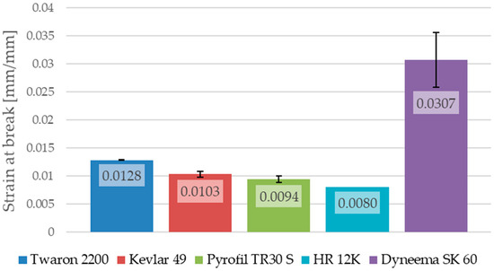 It can be seen that the presented curves are almost linear; single nonlinear behavior of the stress-strain curves are correlated with damage to the polymeric matrix of the composites. Therefore, the calculation of the strain at break based on the Young’s modulus (which were determined based on the strain measured by the extensometer) was not burdened with a large error. The results of the conducted research are shown in Table 6.