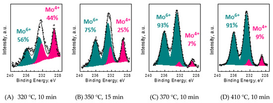 X-ray photoelectron spectroscopy (XPS): XPS was conducted in the multi chamber ultrahigh vacuum system (manufactured by Omicron Nanotechnology, Taunusstein, Germany) equipped with a hemispherical energy analyzer Phoibos 150 (manufactured by SPECS, Berlin, Germany) with a 2D-CCD detector. DAR 400 X-ray lamp with a non-monochromatic radiation of 1253.64 eV (Mg Kα) was used. The spectra for analysis of chemical shifts in Mo 3d core lines were collected with pass energy of 30 eV in “Fixed Analyzer Transmission” mode. For the peak fitting procedure, the CasaXPS (v.2.3, Casa Software Ltd., Teignmouth, UK) software was used. To ensure repeatability of the analysis of all samples, the same set of components with fixed energy separation was used for each of them. The binding energies of the measured spectra were calibrated to the C 1s core line position at 285 eV. For all of the investigated samples, an observed charging effect did not exceed 2 eV and no hardware charge compensation was needed.