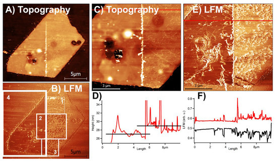Removing the surface-bound MoO3 oxide layer on a single MoS2 flake with an AFM tip. The images show AFM recorded topography for (A,C) and uncalibrated friction (LFM signal) for (B,E). (B) shows that the flake was continuously scratched in zones 1, 2, 3 and 4 with a progressively increasing number of rescans between the zones. In the zone “4” the flake was rescanned more than 10 times, which produced complete removal of the oxide layer. (C) shows a close-up on the topography data from (A). (D) presents a topography cross-section line, marked in red in (C), to show that a removed oxide layer was 2 ± 1 nm thick. (E) shows an LFM signal corresponding to (C). (F) shows a friction loop along a cross-sectional line presented in red in (E). A friction loop is an LFM signal recorded in trace (R− > L) and retrace (L− > R) scanning. It corresponds to twice of the uncalibrated friction. For (A,C) brighter colors represent higher portions of the image (Z-scale), while for (B,E) brighter colors represent higher values of the lateral force microscopy (LFM) signal. Z-scale in (A) was 60 nm or (C) 43 nm.