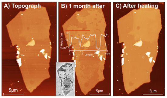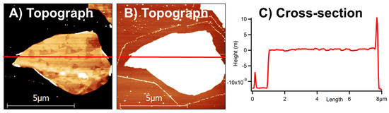 Etching and shrinking of a single MoS2 flake. (A,B) show topography images of the flake, with the Z-scale of several nanometers only in each. (A) is centered on a basal flake surface and (B) is centered on a surface of the silicon substrate. (C) presents a topographical cross-section taken laterally in a middle of the flake, as shown in A and B, in red. The flake is 12 ± 2 nm thick.