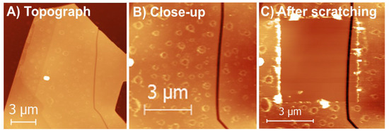 After many trials and using high resolution, contact non-contact/tapping AFM imaging, we could not detect any obvious MoO3 islands on and/or in the vicinity of the triangular etch pits on the XPS studied samples till heating them at 370 °C. We did not quit searching for the surface-bound MoO3 layers on the prepared batch of samples; XPS results in Figure 2 clearly show the prevailing presence of oxides on the samples heated between 350 and 410 °C. Furthermore, the XPS results did not change upon sample annealing at 210 °C for 30 min, confirming that the Mo oxide stayed there even after annealing. This is why we decided to locally scratch several samples heated between 350 and 370 °C. Indeed, after several passages of a scanning AFM tip, we managed, at least in several cases, to break through a complete layer of the likely MoO3 oxide after applying normal forces of up to several nN. While continuing the scratching process, we managed to remove any remaining pieces of the scratched layer and to expose a fresh basal plane of the Mo disulfide.