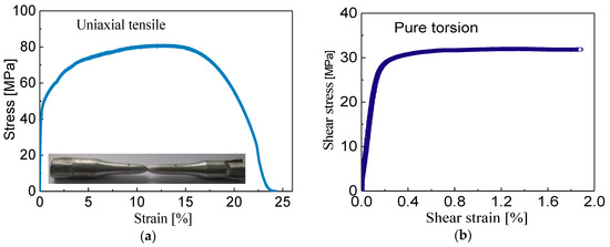 The experiments are conducted by an MTS809 tension-torsional servo-controlled hydraulic testing machine (MTS Systems Corporation, Eden Prairie, MN, USA) at room temperature. An extensometer with a 25-mm gauge length is calibrated to measure the axial and torsion strain of the gauge section of specimens. The stress-strain curves of σ(ε) in uniaxial tension and τ(γ) in pure torsion are displayed in Figure 3. The stress–strain behaviour under uniaxial tensile loading exhibits the pronounced strain hardening effect in which a high strain-hardening rate is observable with the increase of axial strain. Unlike the axial component of flow stress, the stress–strain curve obtained from the pure torsion experiment shows the lower strain hardening behavior.
