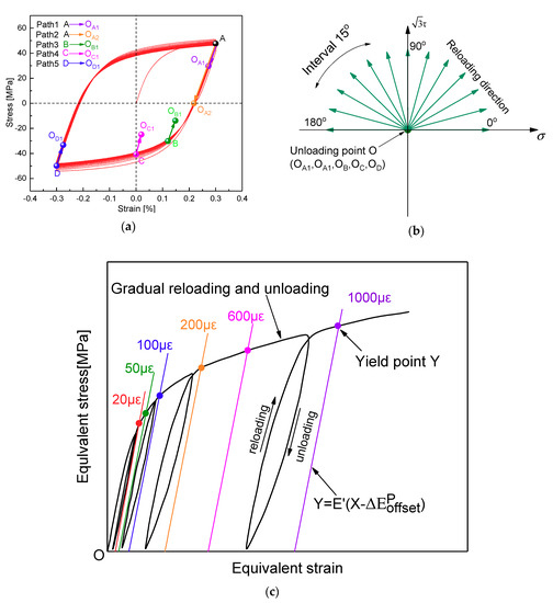 The definition of yield points adopted here is the unloading stiffness method, considering the unloading stiffness decreases with the increase of offset strain [5,6,7], The unloading stiffness E’ corresponding to each offset strain is determined by the method of gradual reloading and unloading, as shown in Figure 4c. First, the specimen is reloaded from the unloading point to the stress state approach to the target offset strain , then the specimen is unloaded back to the unloading point, and the unloading stiffness E′ is determined by fitting the linear portion of the unloading curve. By drawing a straight line , which parallels the unloading stiffness E′, the intersection of the straight line and the equivalent stress–strain curve is defined as the subsequent yield point represented by Y. By repeating this reloading–unloading process, the subsequent yield points corresponding to each given target strain 20 με, 50 με, 100 με, 200 με, 600 με, and 1000 με in each reloading direction can be determined completely.