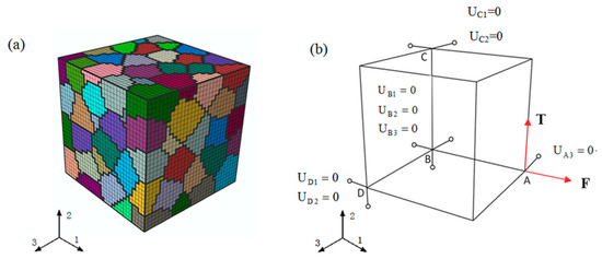 The representative volume element (RVE) model containing 125 grains and the loading boundary condition: (a) RVE model; (b) loading boundary condition.