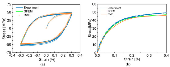 The three independent elastic constants of single crystal aluminum that characterize the anisotropic elasticity tensor , and are obtained from the aluminum elastic properties as a function of elastic modulus , shear modulus , which are identified by matching the experimental uniaxial tensile and torsion stress-strain curves in the linear region for this alloy, and Poisson’s ratio , which is prescribed as . The reference strain rate is prescribed as 0.001/s−1, which is assumed to the rate-independent material. The rate sensitivity parameter is set to 200, since the pure aluminum is almost strain rate insensitive. The parameter is set to 0, since creep is ignored during cyclic loading. Using these values, the remaining plastic parameters of crystalline plasticity model, namely, , , , , , , and are calibrated by fitting the stress–strain responses by the experiments under cyclic tension-compression loading, as shown in Figure 7a. The initial critical resolved value and its saturated value of shear stress are obtained from the elastic range from the peak points unloading to reverse yielding points in the initial and stable stress–strain hysteresis loop, respectively. For cyclic hardening is less pronounced, the material constant is close to its saturated value . The parameter is the initial hardening rate that describes the hardening rate of materials after they enter plasticity, is the initial slipping hardening modulus and is a constant leading to soften, and are the parameters to describe cyclic hardening rate and saturation rate of the stress-strain hysteresis curve, respectively. Further, the applied material parameters are adjusted repeatedly until the simulated stress–strain stabilized loop and tensile curve are well-matched with the experimental results in Figure 7. It is obvious that the computationally obtained cyclic stress-strain loop is in good agreement with the experimental results, verifying that the parameters used in crystal plasticity model are enough accurate. The finial elastic and plastic property parameters used in the crystal plasticity model are summarized and listed in Table 2.