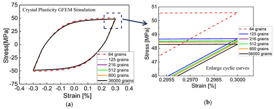 The computationally obtained stress–strain cyclic curves for the GFEM with a different number of grains by crystal plasticity under cyclic tension-compression loading are given in Figure 9. It also predicts a slightly higher stress less than 2 MPa with 64 grains than that other grains. It is obvious that computational results of the stress–strain curves almost converge for the center gauge region of the GFEM containing more than 125 grains. From this sensitivity study, it is found that the GFEM with 125 grains are employed to show a converged macroscopic stress–strain response. This insensitivity of numerically computed mechanical behavior to the number of grains is resulted from the randomly arranged orientation and size of grains. The systematically predicted macroscopic stress–strain curves using the models with each grain containing many elements are more closely approximated to that adopting the model with each element representing one grain. Therefore, the thin-walled finite element model in the center gauge region which contains a total of 36,000 elements and 36,000 grains can be adopted in the following computations.